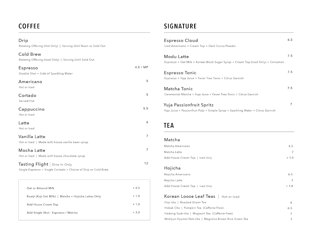 Welcome to Modu Cafe, a delightful spot nestled in Highland Park, Los Angeles. This coffee haven opens its doors at 7 AM, welcoming patrons with an ambiance that exudes simplicity and sophistication. The menu showcases an impressive selection of beverages and baked goods, designed to tantalize your taste buds.
